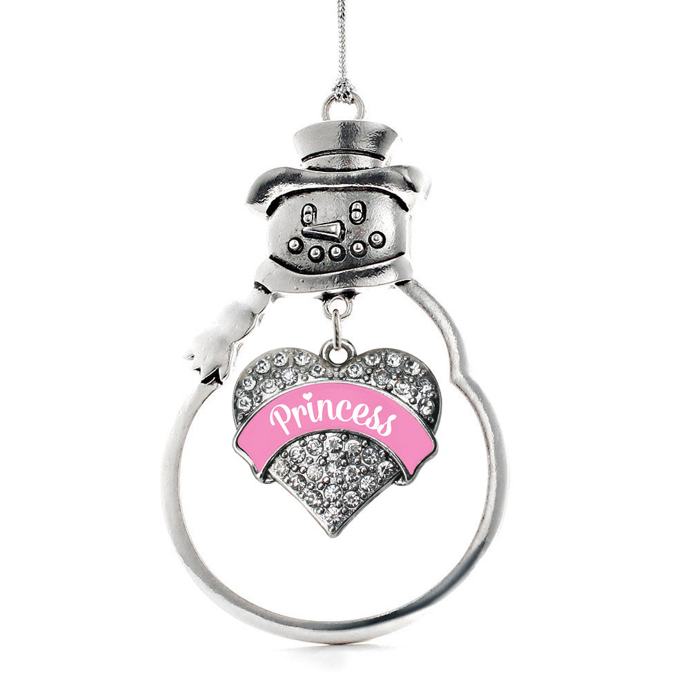 Our sparkling snowman ornament, equipped with a stylish silver rope and the Princess - Pink pave heart charm, is crafted from white metal with a silver plated finish and accented with cubic zirconia stones.