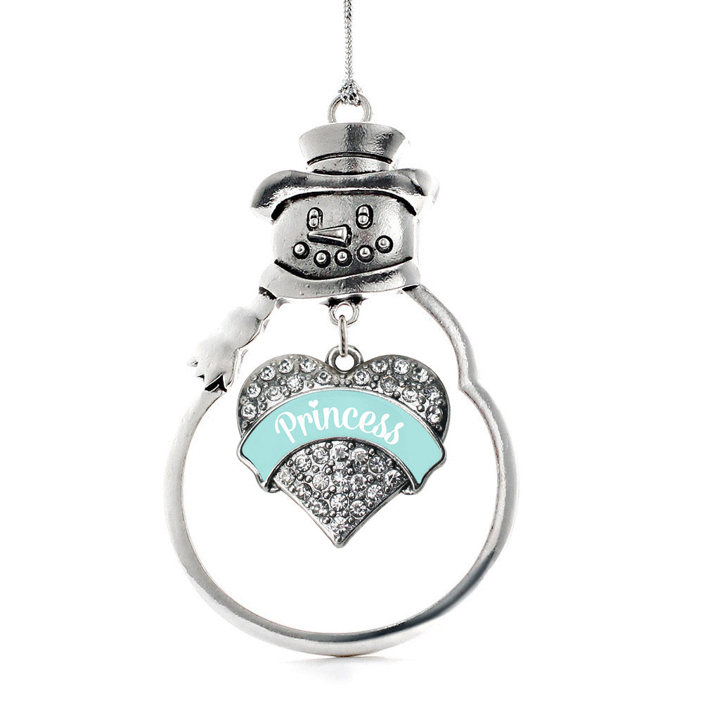 Our sparkling snowman ornament, equipped with a stylish silver rope and the Princess - Teal pave heart charm, is crafted from white metal with a silver plated finish and accented with cubic zirconia stones.