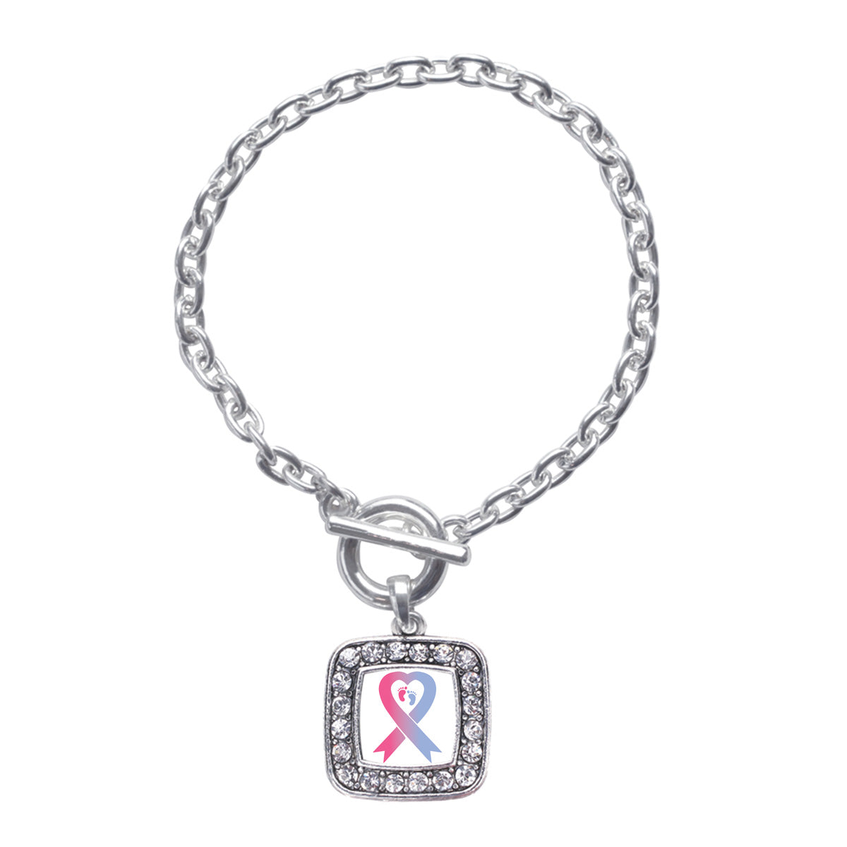 Our sparkling toggle bracelet, equipped with a stylish toggle clasp and the Pro-Life Ribbon square charm, is crafted from white metal with a silver plated finish and accented with cubic zirconia stones.