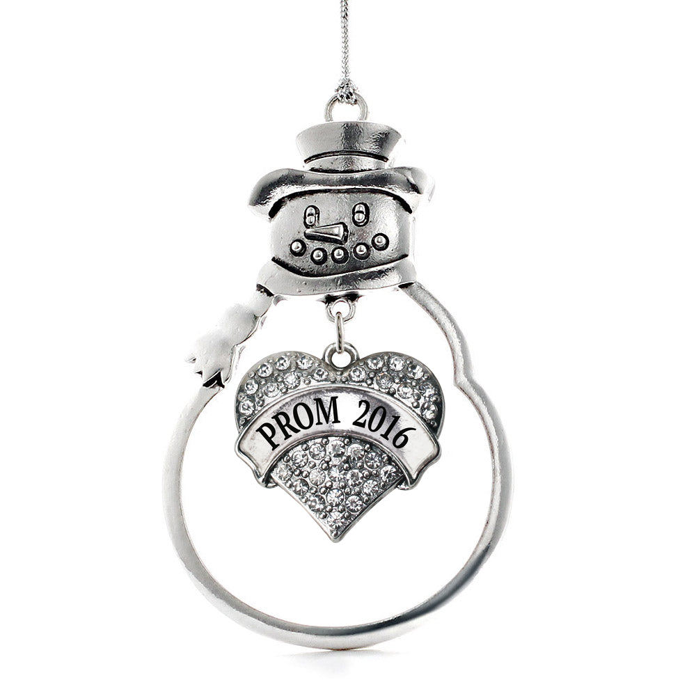 Our sparkling snowman ornament, equipped with a stylish silver rope and the Prom 2016 pave heart charm, is crafted from white metal with a silver plated finish and accented with cubic zirconia stones.