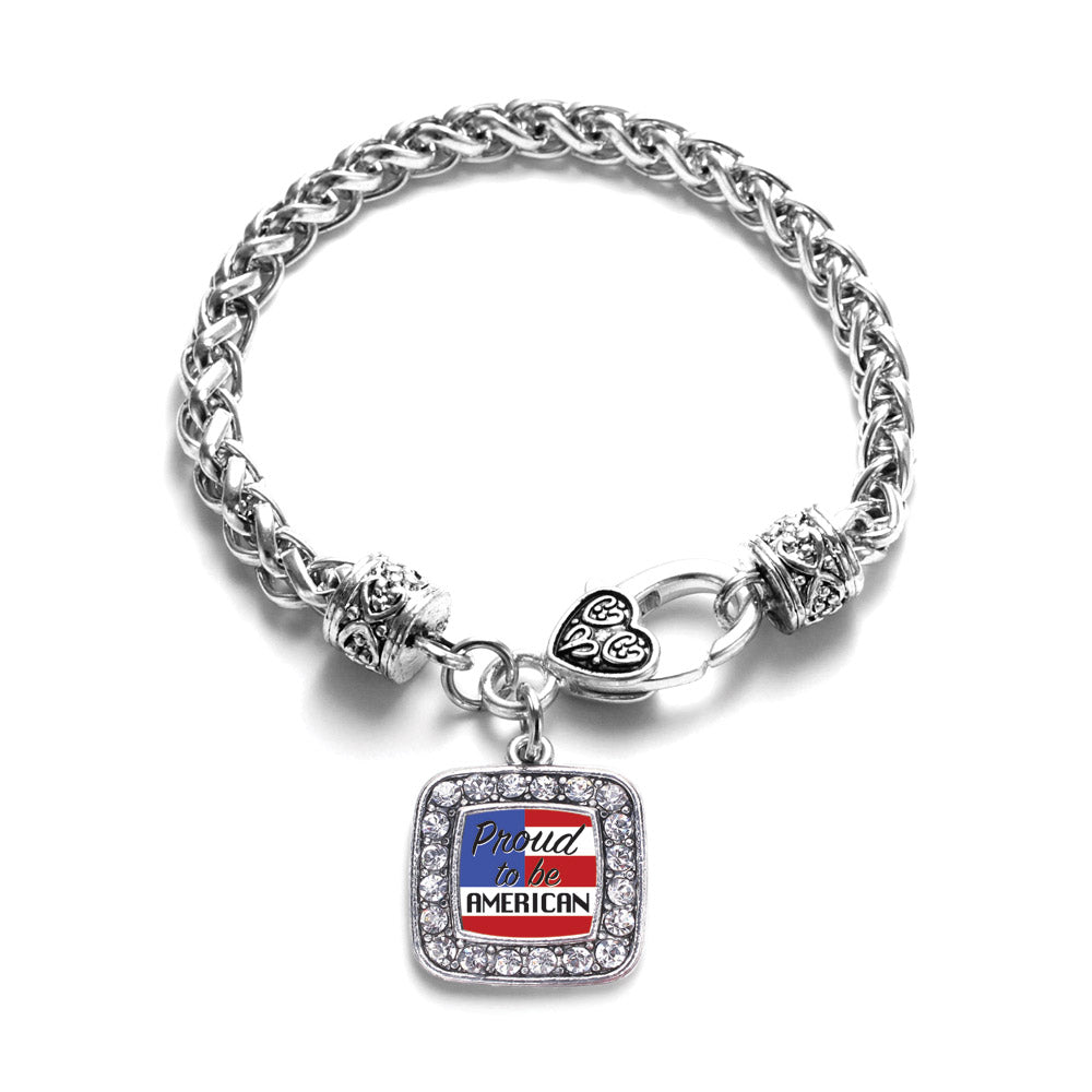 Our sparkling braided bracelet, equipped with a stylish lobster claw clasp and the Proud to be American square charm, is crafted from white metal with a silver plated finish and accented with cubic zirconia stones.
