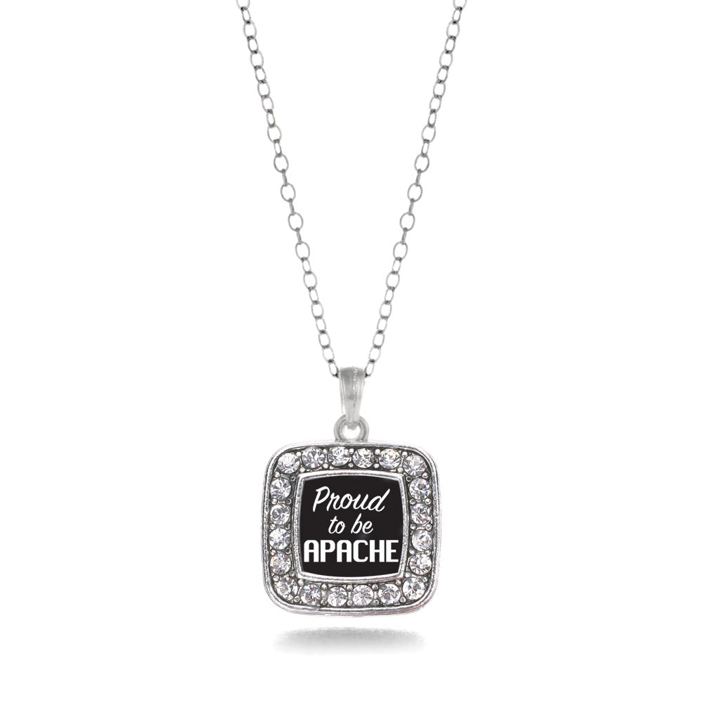 Our sparkling classic necklace, equipped with a stylish lobster claw clasp and the Proud To Be Apache square charm, is crafted from white metal with a silver plated finish and accented with cubic zirconia stones.