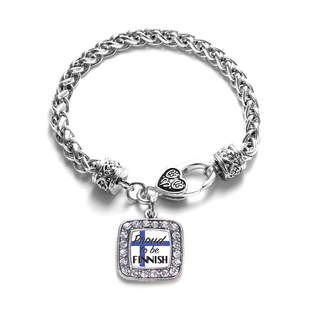 Our sparkling braided bracelet, equipped with a stylish lobster claw clasp and the Proud to be Finnish square charm, is crafted from white metal with a silver plated finish and accented with cubic zirconia stones.