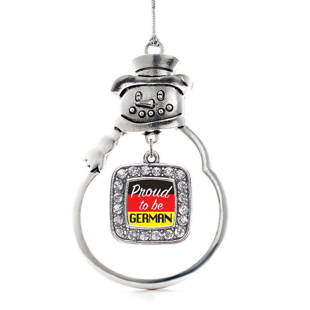 Our sparkling snowman ornament, equipped with a stylish silver rope and the Proud to be German square charm, is crafted from white metal with a silver plated finish and accented with cubic zirconia stones.