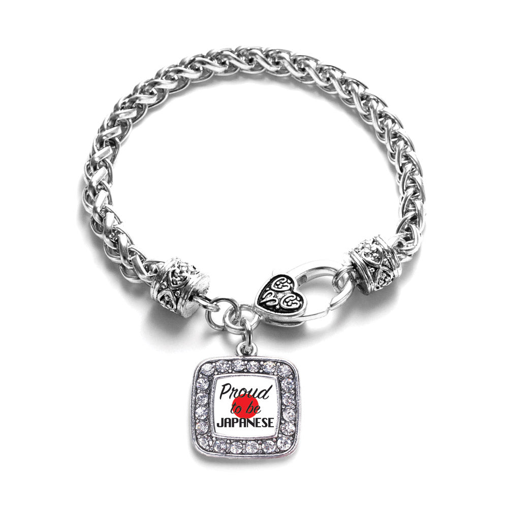 Our sparkling braided bracelet, equipped with a stylish lobster claw clasp and the Proud to be Japanese square charm, is crafted from white metal with a silver plated finish and accented with cubic zirconia stones.
