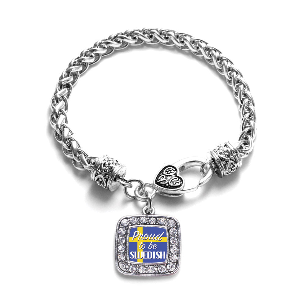 Our sparkling braided bracelet, equipped with a stylish lobster claw clasp and the Proud to be Swedish square charm, is crafted from white metal with a silver plated finish and accented with cubic zirconia stones.