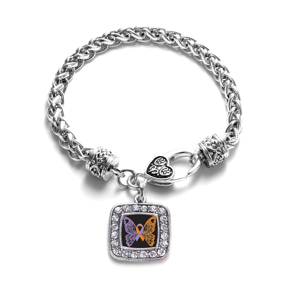 Our sparkling braided bracelet, equipped with a stylish lobster claw clasp and the Psoriasis Awareness Butterfly square charm, is crafted from white metal with a silver plated finish and accented with cubic zirconia stones.