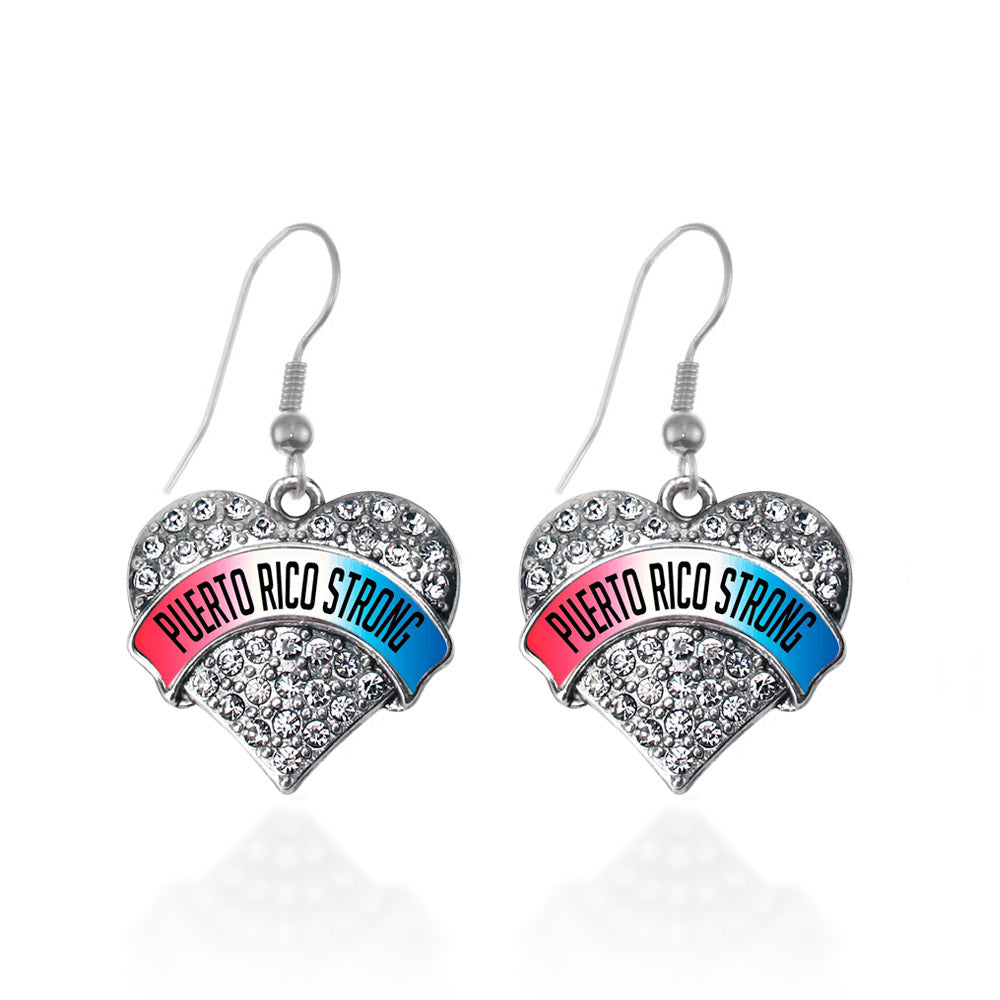 Silver Puerto Rico Strong Pave Heart Charm Dangle Earrings