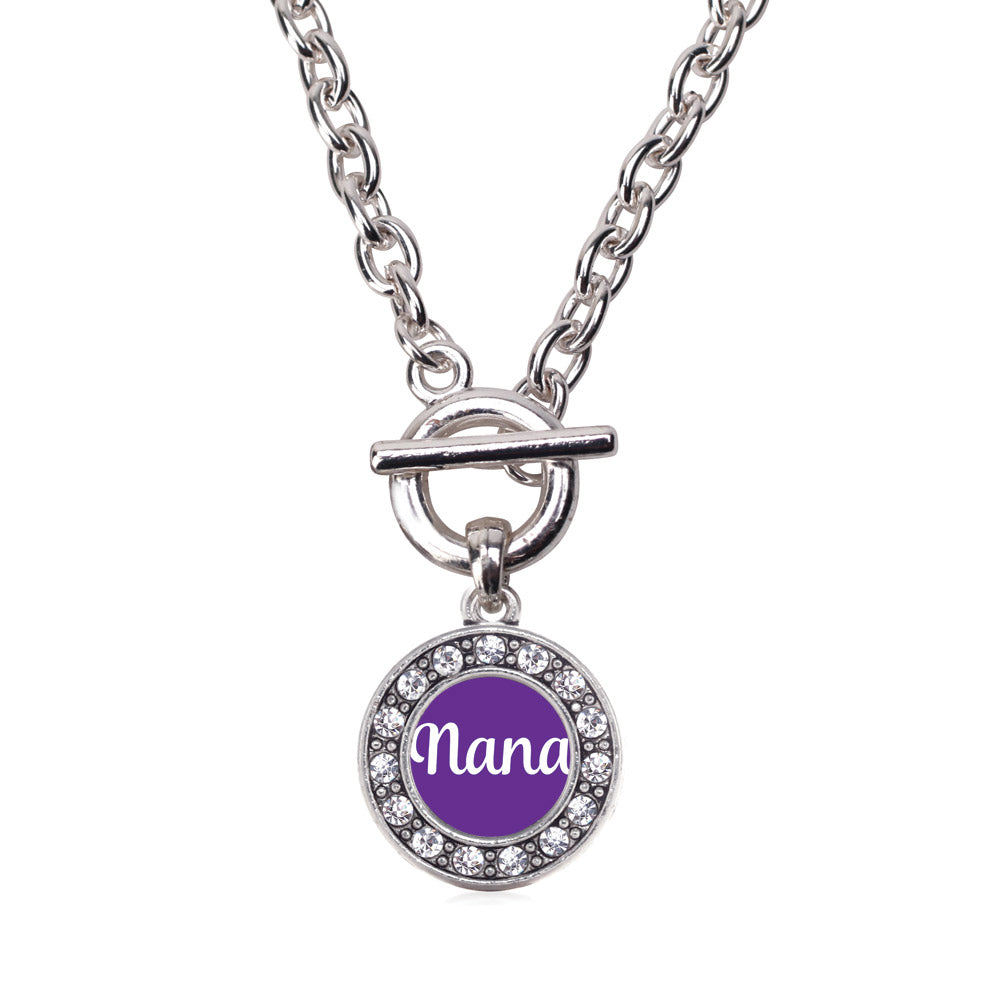 Our sparkling toggle necklace, equipped with a stylish toggle clasp and the Purple Nana circle charm, is crafted from white metal with a silver plated finish and accented with cubic zirconia stones.