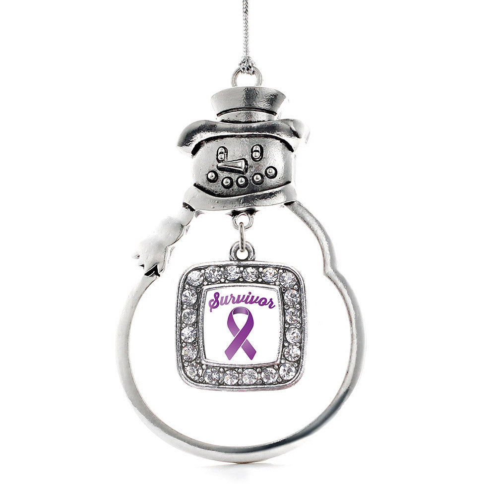 Our sparkling snowman ornament, equipped with a stylish silver rope and the Purple Ribbon Survivor square charm, is crafted from white metal with a silver plated finish and accented with cubic zirconia stones.
