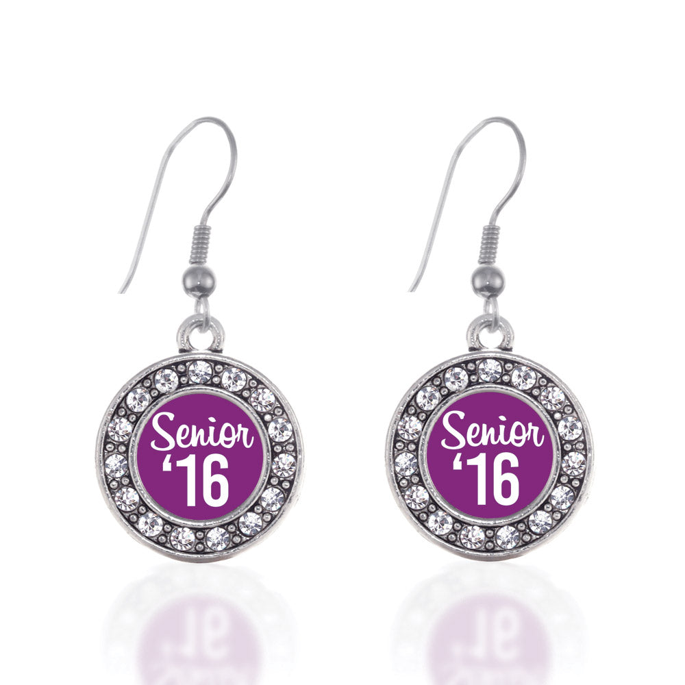 Silver Purple Senior '16 Circle Charm Dangle Earrings