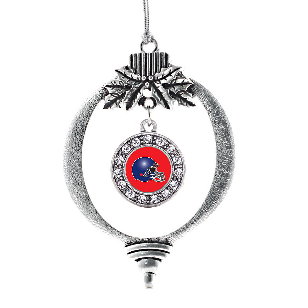 Our sparkling holiday ornament, equipped with a stylish silver rope and the Red and Blue Team Helmet circle charm, is crafted from white metal with a silver plated finish and accented with cubic zirconia stones.