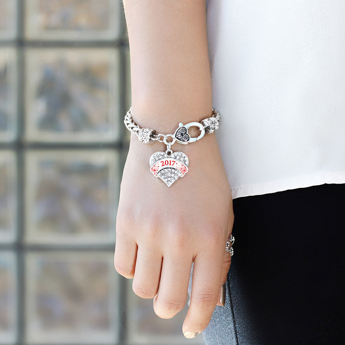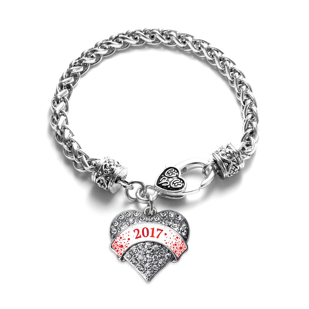 Our sparkling braided bracelet, equipped with a stylish lobster claw clasp and the Red and White Christmas 2017 pave heart charm, is crafted from white metal with a silver plated finish and accented with cubic zirconia stones.