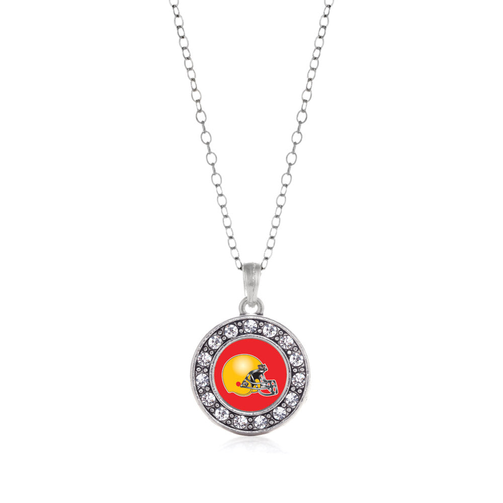 Our sparkling classic necklace, equipped with a stylish lobster claw clasp and the Red and Yellow Team Helmet circle charm, is crafted from white metal with a silver plated finish and accented with cubic zirconia stones.