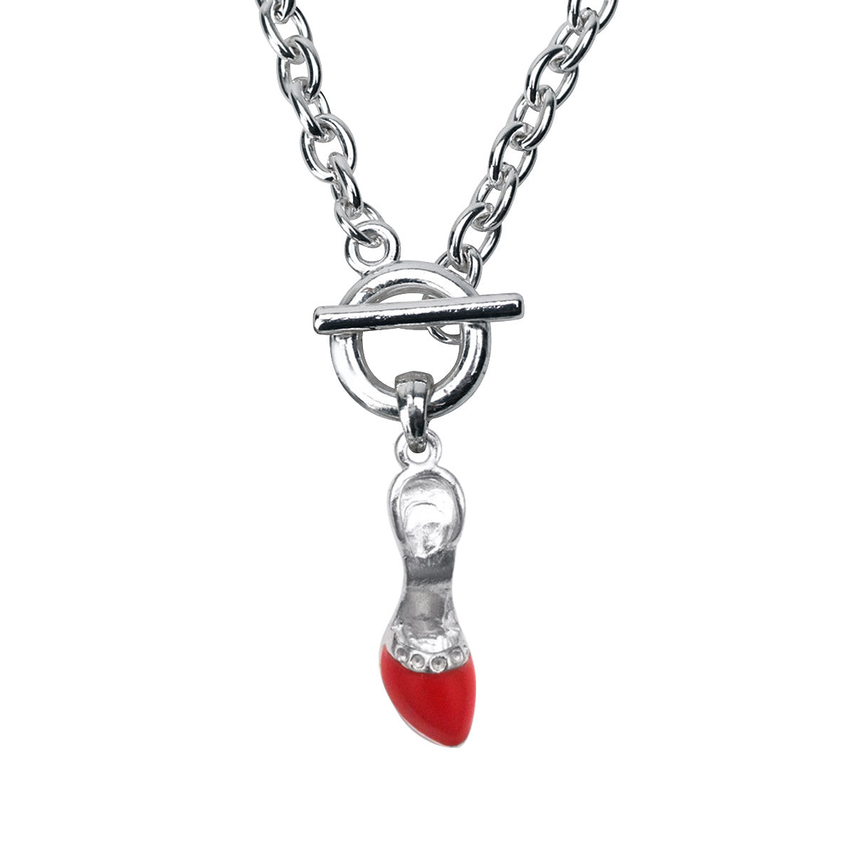 Our sparkling toggle necklace, equipped with a stylish toggle clasp and the Red Heel Shoe charm, is crafted from white metal with a silver plated finish.