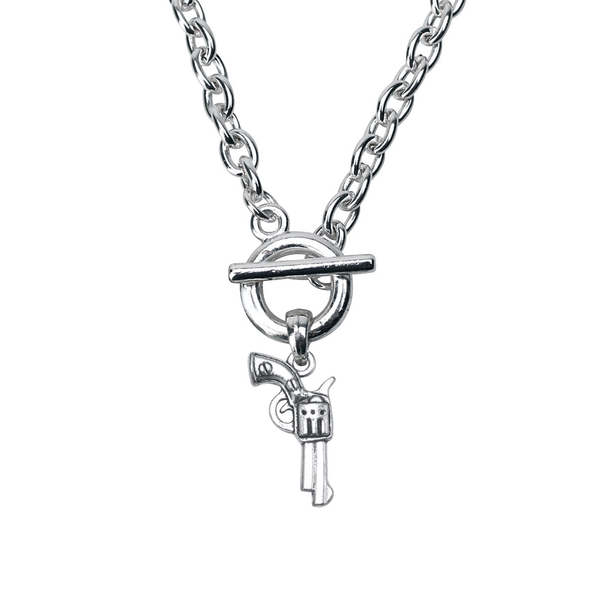 Our sparkling toggle necklace, equipped with a stylish toggle clasp and the Revolver charm, is crafted from white metal with a silver plated finish.