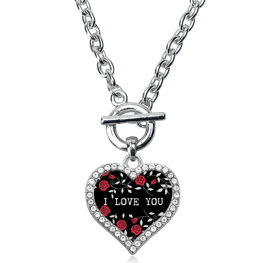 Our sparkling toggle necklace, equipped with a stylish toggle clasp and the Rose Pattern - I LOVE YOU open heart charm, is crafted from white metal with a silver plated finish and accented with cubic zirconia stones.