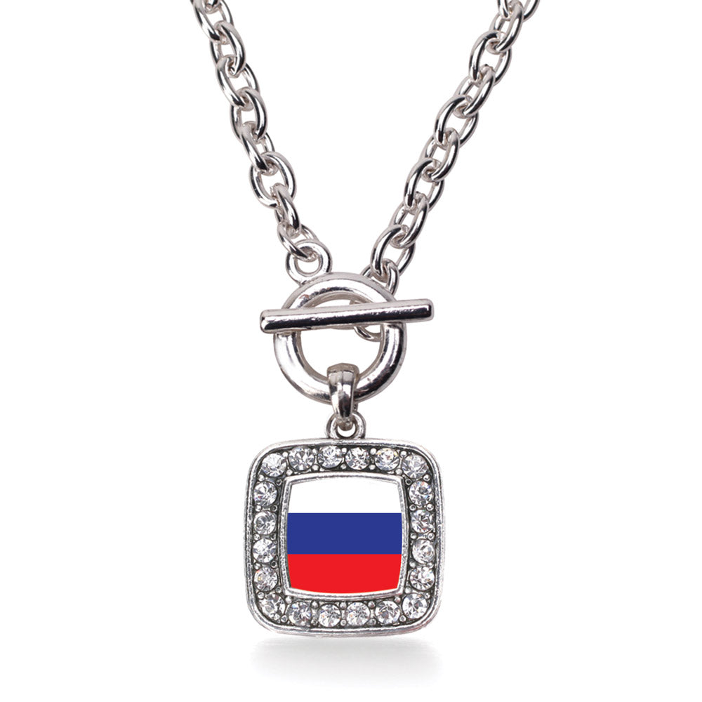 Our sparkling toggle necklace, equipped with a stylish toggle clasp and the Russia Flag square charm, is crafted from white metal with a silver plated finish and accented with cubic zirconia stones.