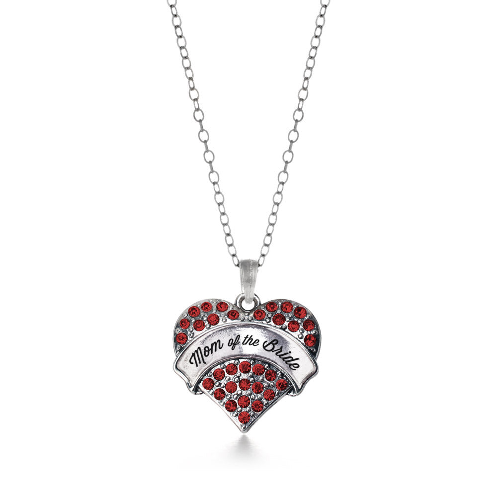 Our sparkling classic necklace, equipped with a stylish lobster claw clasp and the Script Red Mom of the Bride red pave heart charm, is crafted from white metal with a silver plated finish and accented with cubic zirconia stones.