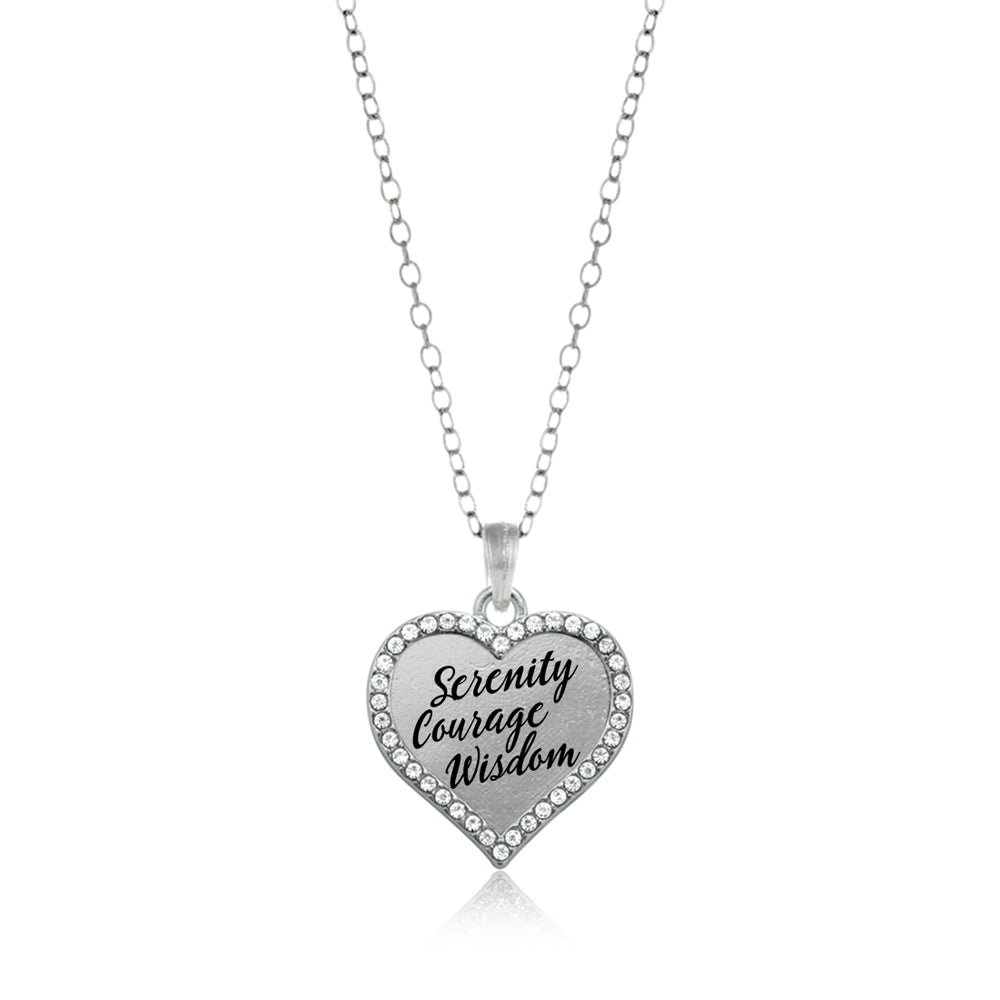 Our sparkling classic necklace, equipped with a stylish lobster claw clasp and the Serenity Prayer open heart charm, is crafted from white metal with a silver plated finish and accented with cubic zirconia stones.