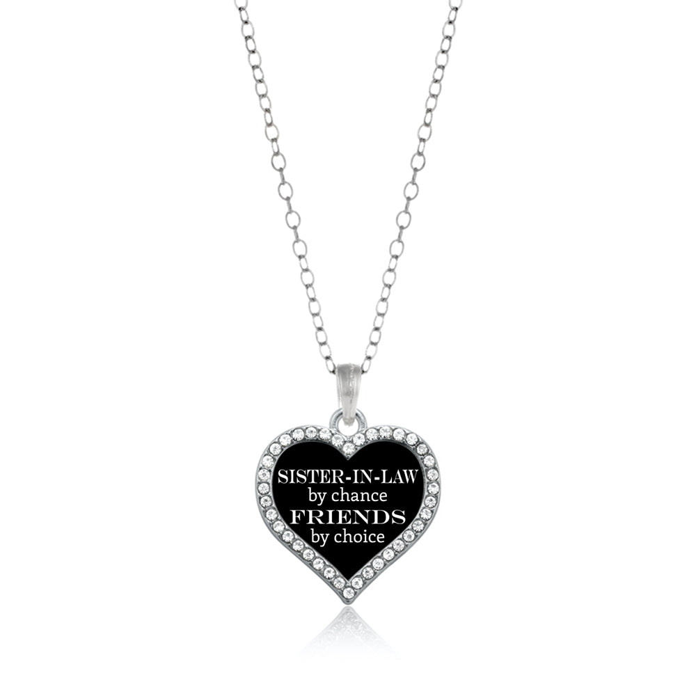 Our sparkling classic necklace, equipped with a stylish lobster claw clasp and the Sister-in-law by Chance, Friends by Choice open heart charm, is crafted from white metal with a silver plated finish and accented with cubic zirconia stones.