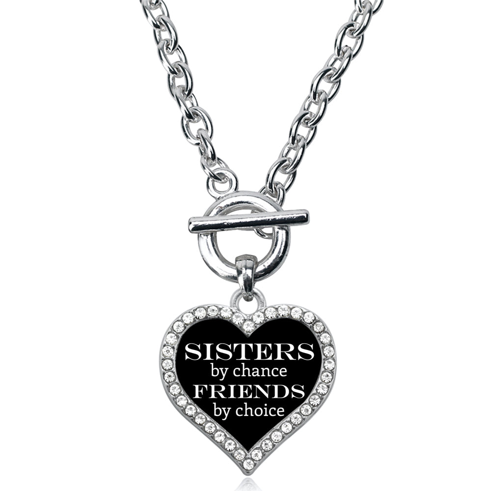 Our sparkling toggle necklace, equipped with a stylish toggle clasp and the Sisters by Chance, Friends by Choice open heart charm, is crafted from white metal with a silver plated finish and accented with cubic zirconia stones.