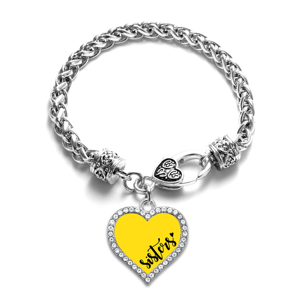 Our sparkling braided bracelet, equipped with a stylish lobster claw clasp and the Sisters - Yellow open heart charm, is crafted from white metal with a silver plated finish and accented with cubic zirconia stones.