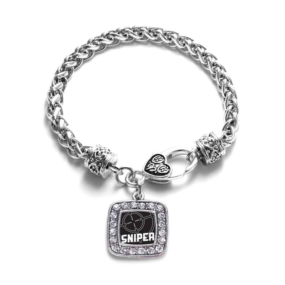 Our sparkling braided bracelet, equipped with a stylish lobster claw clasp and the Sniper square charm, is crafted from white metal with a silver plated finish and accented with cubic zirconia stones.