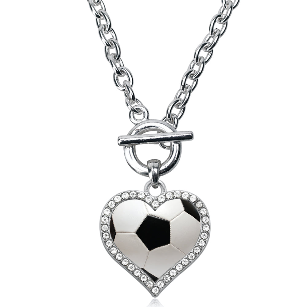 Our sparkling toggle necklace, equipped with a stylish toggle clasp and the Soccer Ball open heart charm, is crafted from white metal with a silver plated finish and accented with cubic zirconia stones.