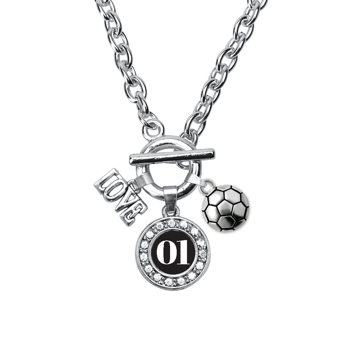 Our sparkling toggle necklace, equipped with a stylish toggle clasp and the Soccer - Sports Number 01 circle charm, is crafted from white metal with a silver plated finish and accented with cubic zirconia stones.