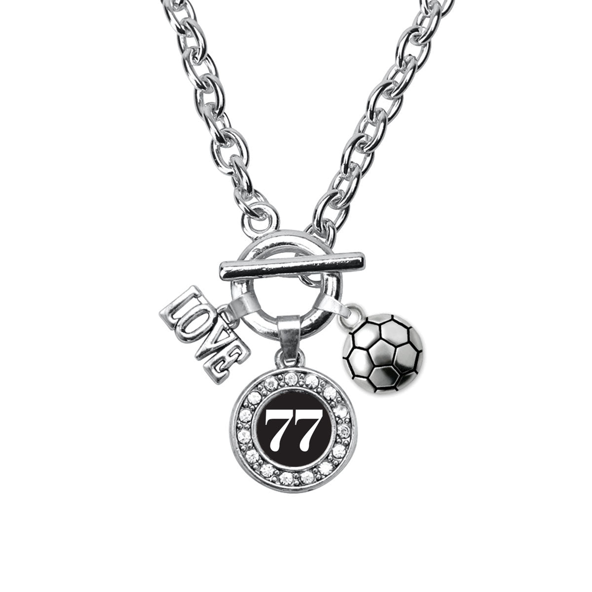 Our sparkling toggle necklace, equipped with a stylish toggle clasp and the Soccer - Sports Number 77 circle charm, is crafted from white metal with a silver plated finish and accented with cubic zirconia stones.