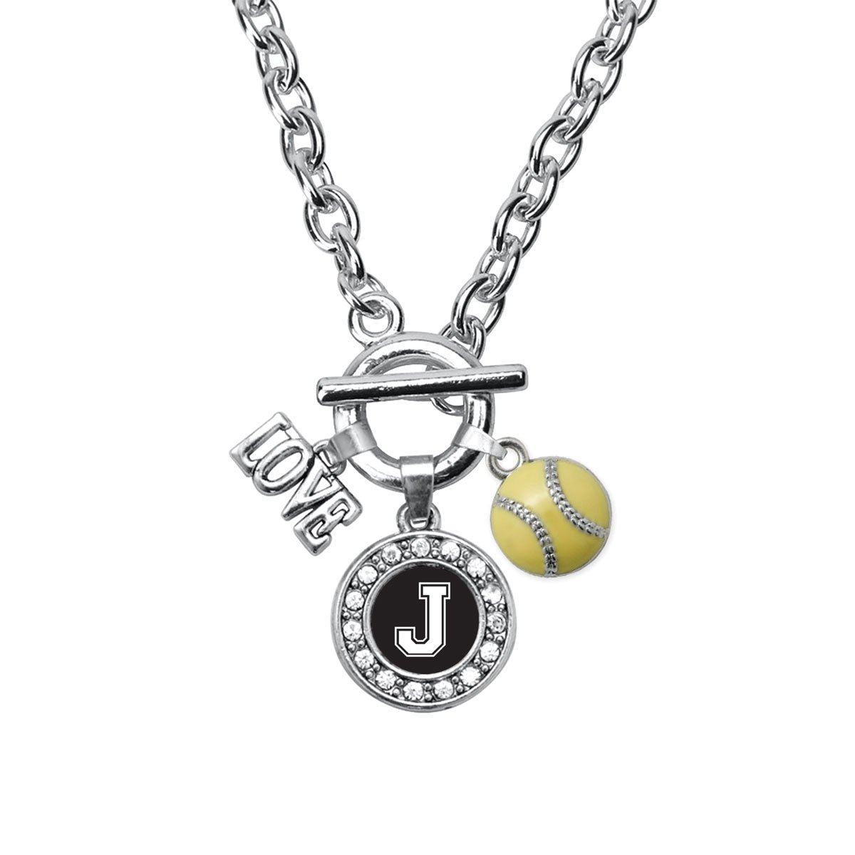 Our sparkling toggle necklace, equipped with a stylish toggle clasp and the Softball - Sports Initial J circle charm, is crafted from white metal with a silver plated finish and accented with cubic zirconia stones.