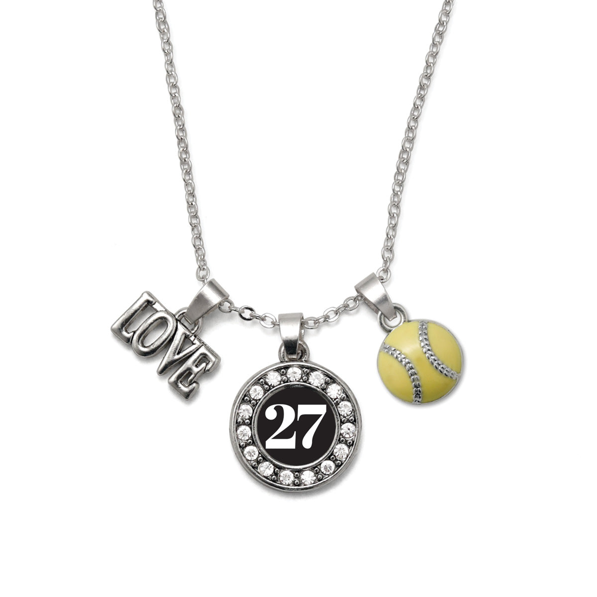 Our sparkling classic necklace, equipped with a stylish lobster claw clasp and the Softball - Sports Number 27 circle charm, is crafted from white metal with a silver plated finish and accented with cubic zirconia stones.