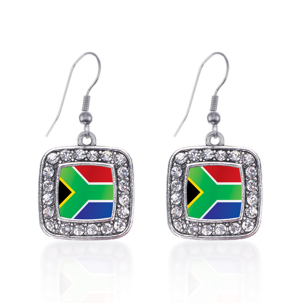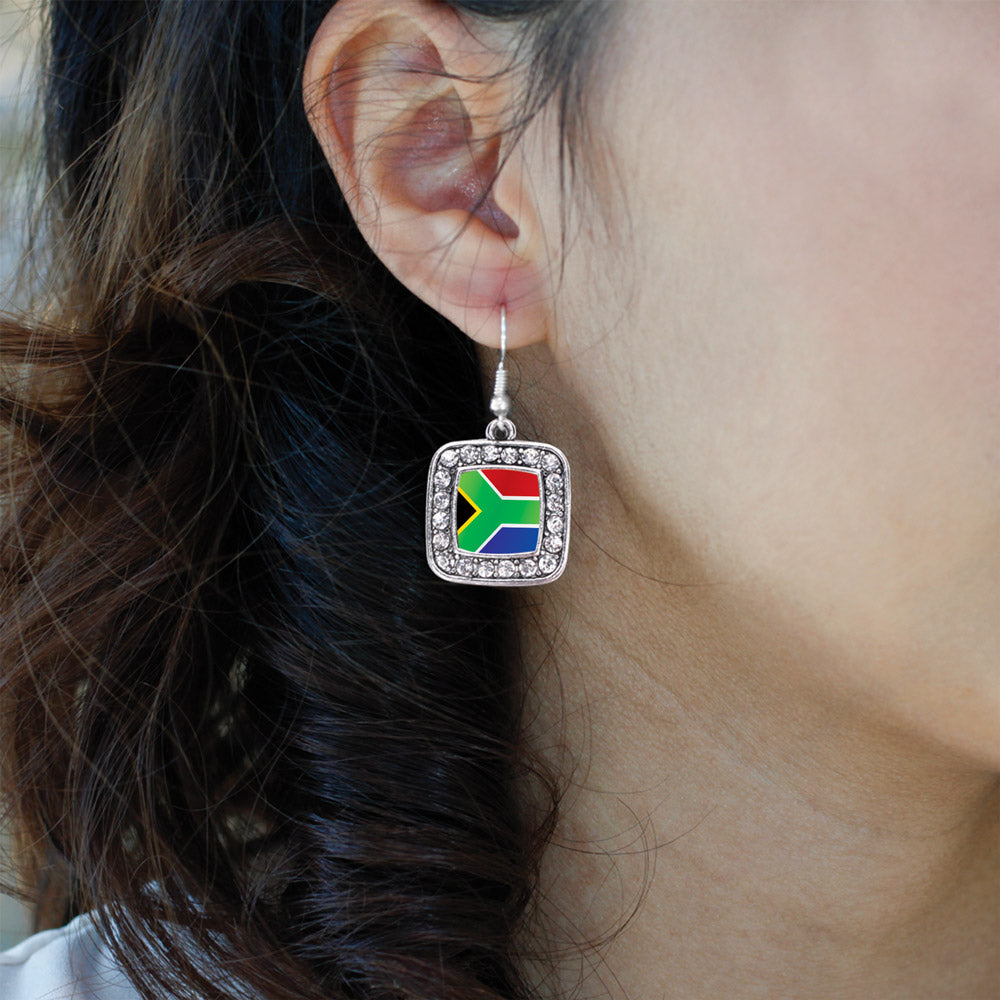 Silver South Africa Flag Square Charm Dangle Earrings