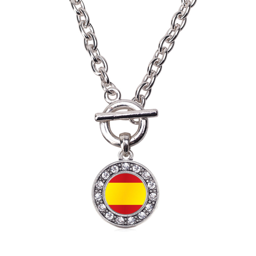 Our sparkling toggle necklace, equipped with a stylish toggle clasp and the Spain Flag circle charm, is crafted from white metal with a silver plated finish and accented with cubic zirconia stones.
