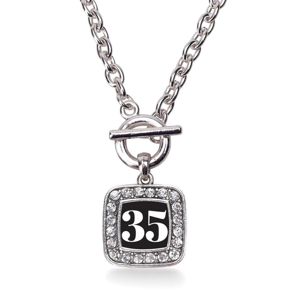 Our sparkling toggle necklace, equipped with a stylish toggle clasp and the Sport Number 35 square charm, is crafted from white metal with a silver plated finish and accented with cubic zirconia stones.