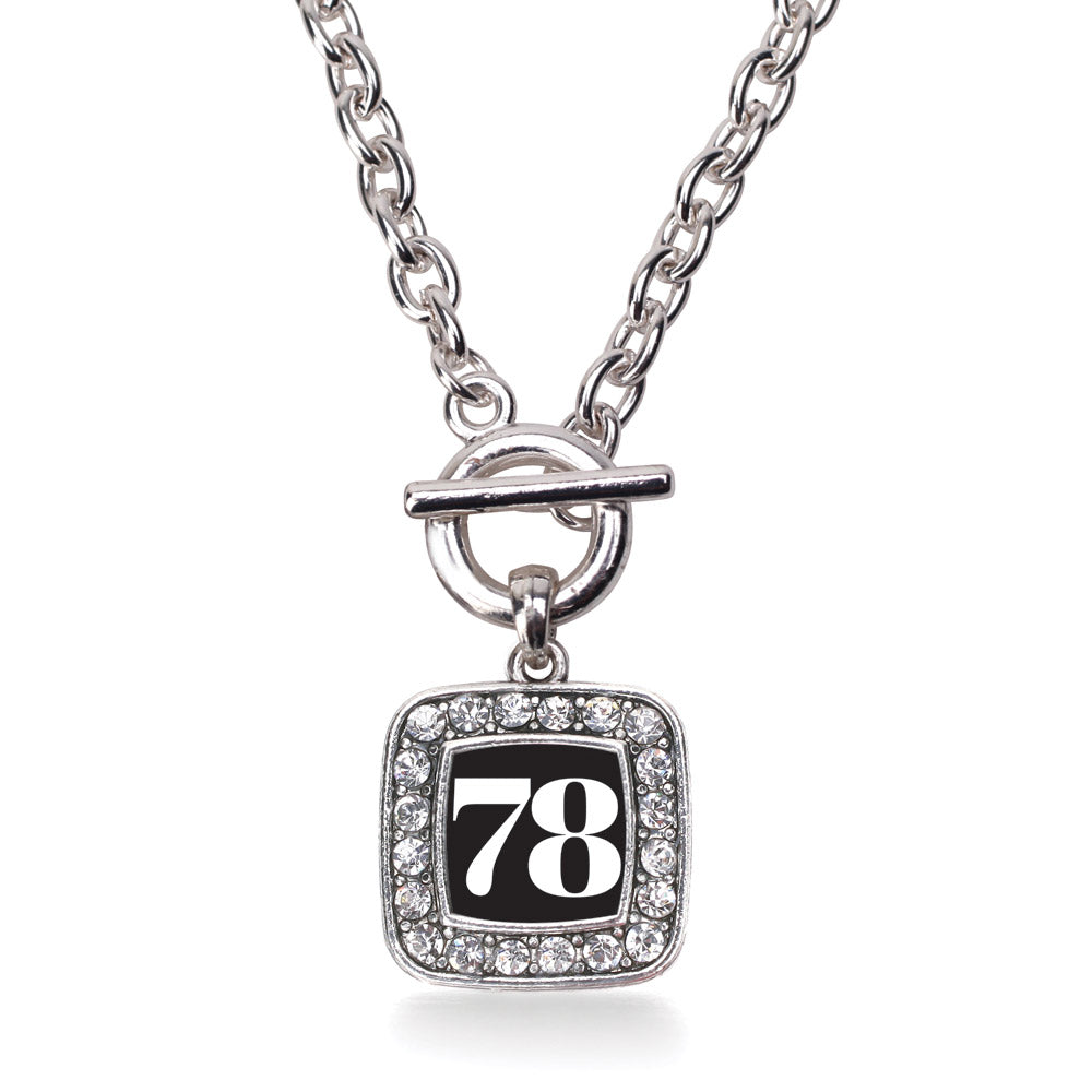 Our sparkling toggle necklace, equipped with a stylish toggle clasp and the Sport Number 78 square charm, is crafted from white metal with a silver plated finish and accented with cubic zirconia stones.