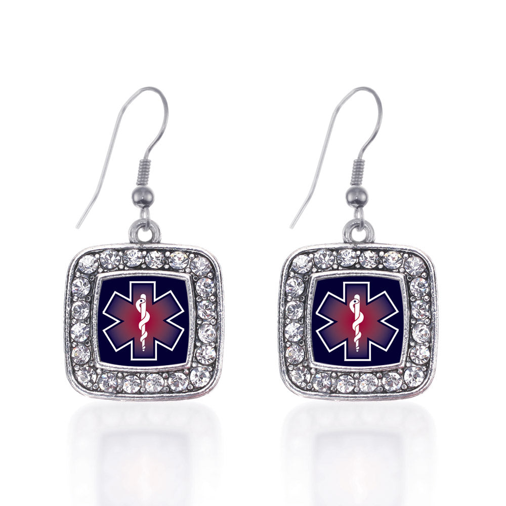 Our sparkling dangle earrings, equipped with a stylish french hook backing and the Star Of Life EMT / EMS square charm, is crafted from white metal with a silver plated finish and accented with cubic zirconia stones.