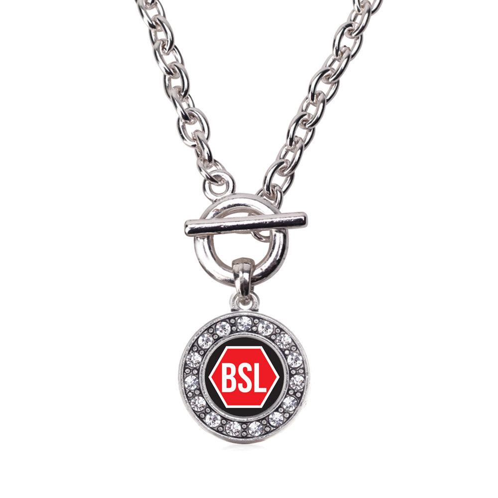 Our sparkling toggle necklace, equipped with a stylish toggle clasp and the STOP BSL circle charm, is crafted from white metal with a silver plated finish and accented with cubic zirconia stones.