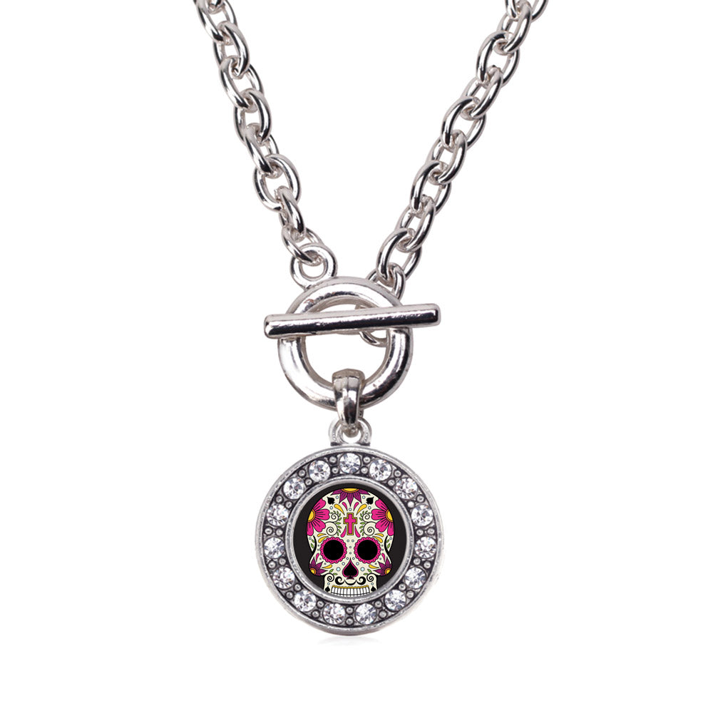 Silver Sugar Skull Circle Charm Toggle Necklace