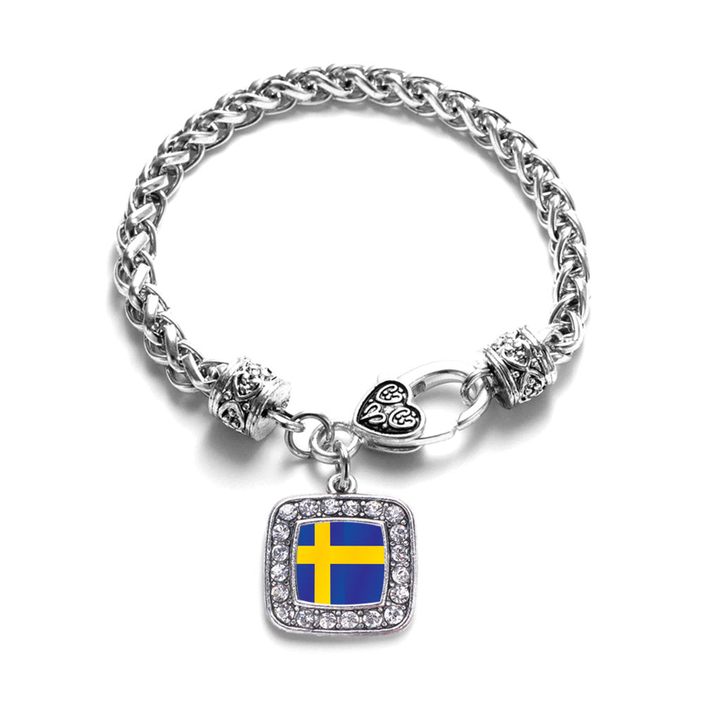 Our sparkling braided bracelet, equipped with a stylish lobster claw clasp and the Sweden Flag square charm, is crafted from white metal with a silver plated finish and accented with cubic zirconia stones.
