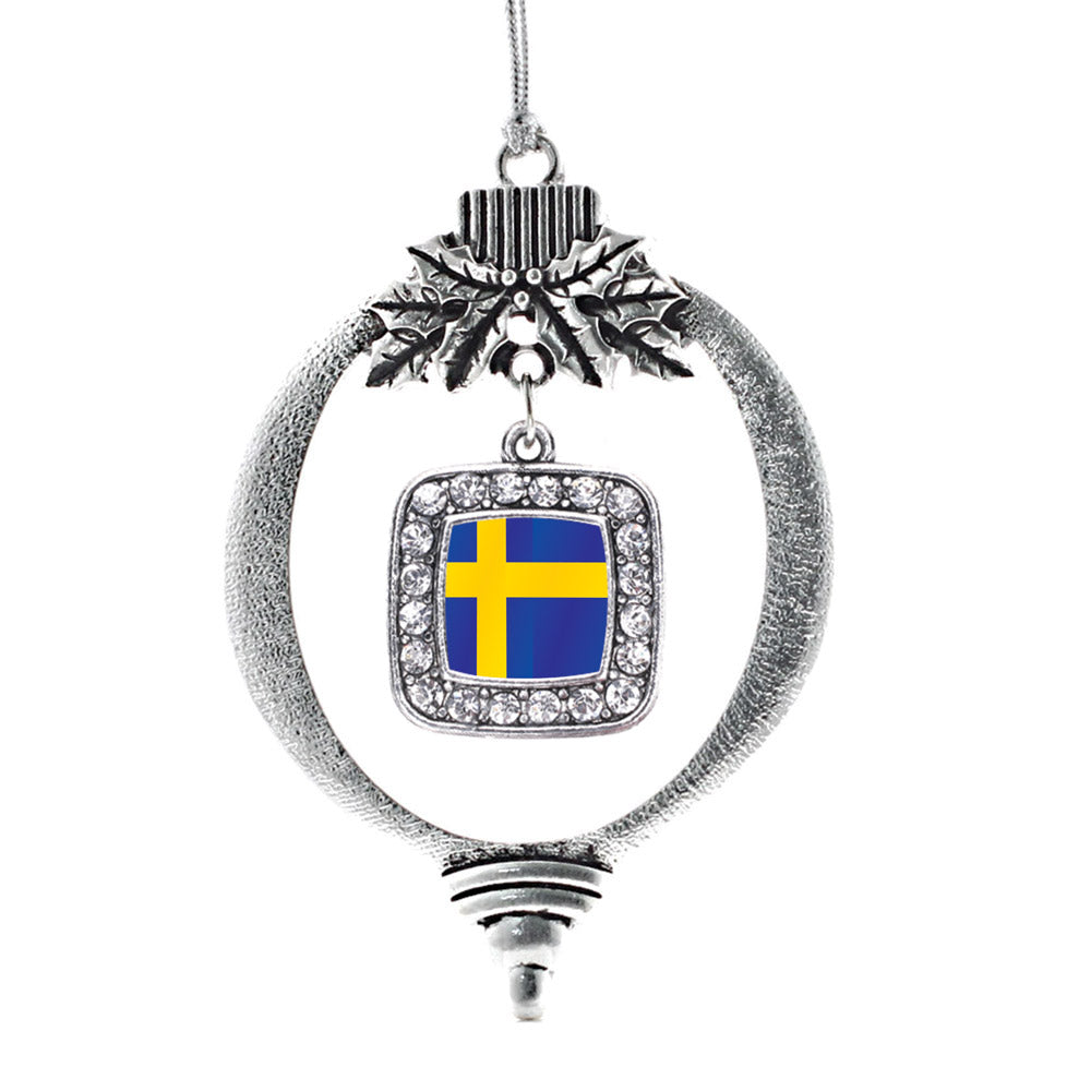 Our sparkling holiday ornament, equipped with a stylish silver rope and the Sweden Flag square charm, is crafted from white metal with a silver plated finish and accented with cubic zirconia stones.