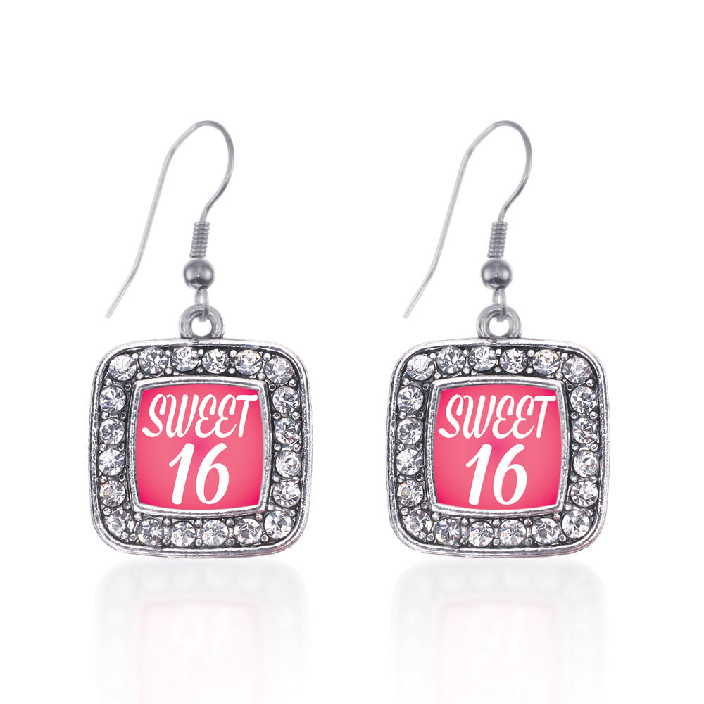 Silver Sweet Sixteen Square Charm Dangle Earrings