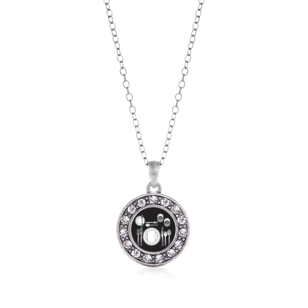 Our sparkling classic necklace, equipped with a stylish lobster claw clasp and the Table Set circle charm, is crafted from white metal with a silver plated finish and accented with cubic zirconia stones.