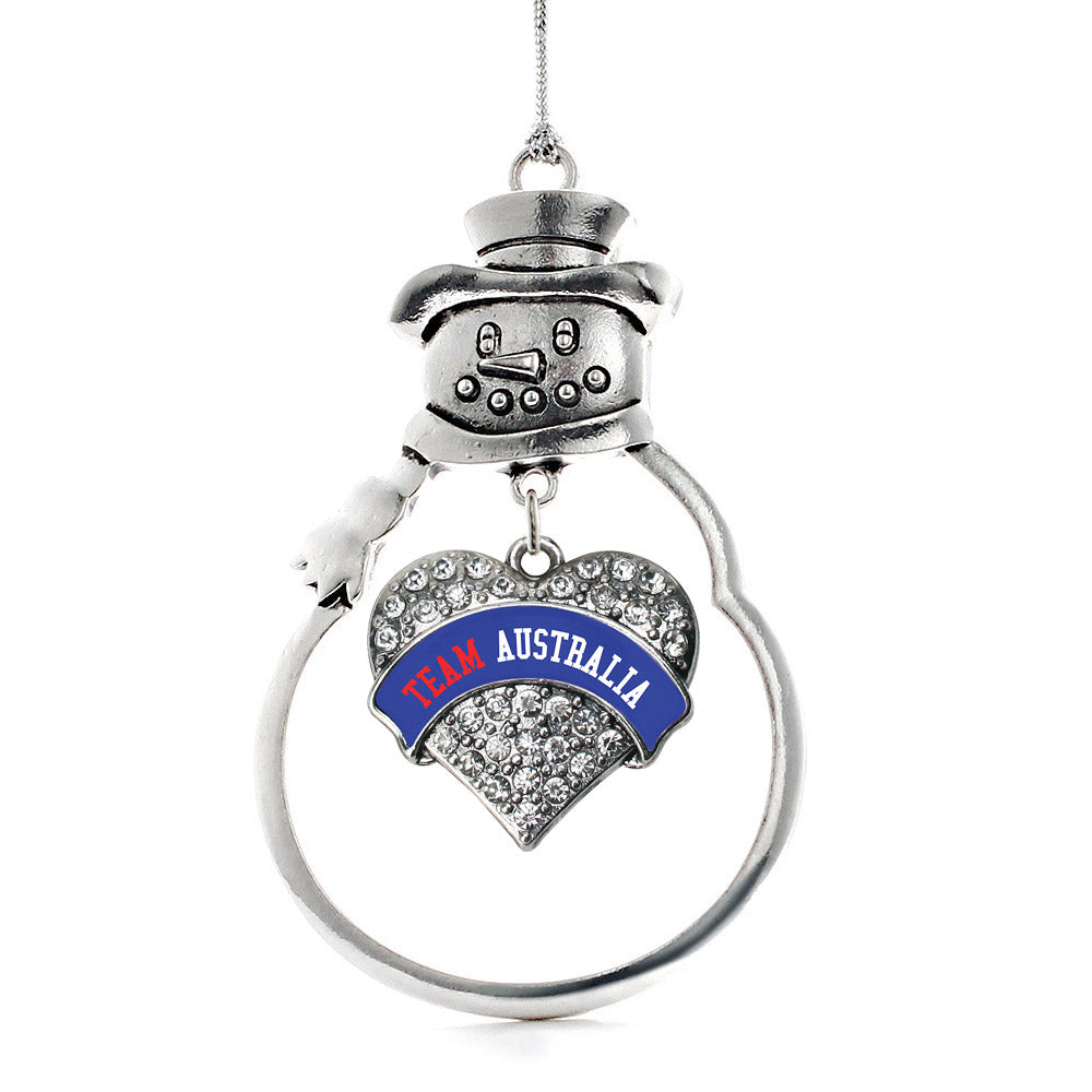 Our sparkling snowman ornament, equipped with a stylish silver rope and the Team Australia pave heart charm, is crafted from white metal with a silver plated finish and accented with cubic zirconia stones.