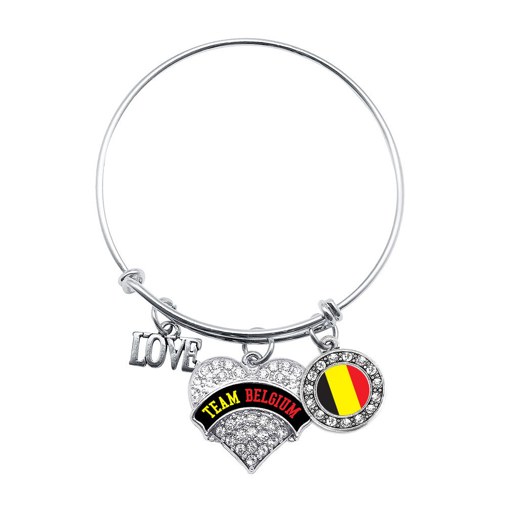 Our sparkling wire bangle bracelet, equipped with the Team Belgium pave heart charm, is crafted from white metal with a silver plated finish and accented with cubic zirconia stones.