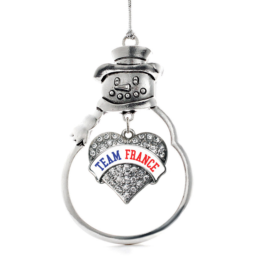 Our sparkling snowman ornament, equipped with a stylish silver rope and the Team France pave heart charm, is crafted from white metal with a silver plated finish and accented with cubic zirconia stones.