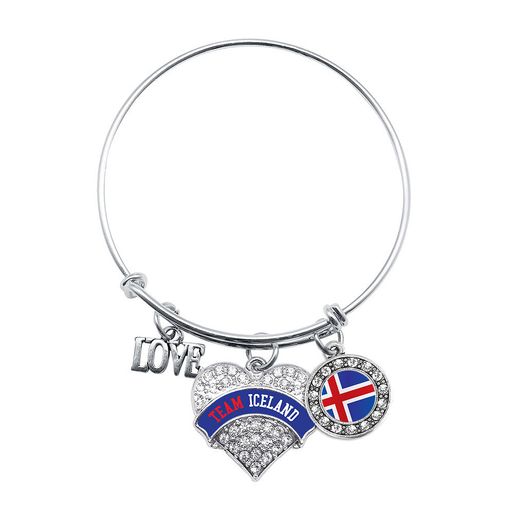 Our sparkling wire bangle bracelet, equipped with the Team Iceland pave heart charm, is crafted from white metal with a silver plated finish and accented with cubic zirconia stones.