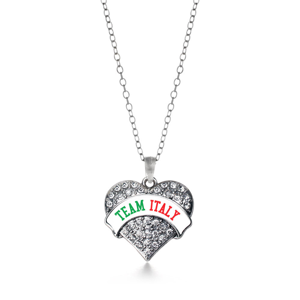 Our sparkling classic necklace, equipped with a stylish lobster claw clasp and the Team Italy pave heart charm, is crafted from white metal with a silver plated finish and accented with cubic zirconia stones.