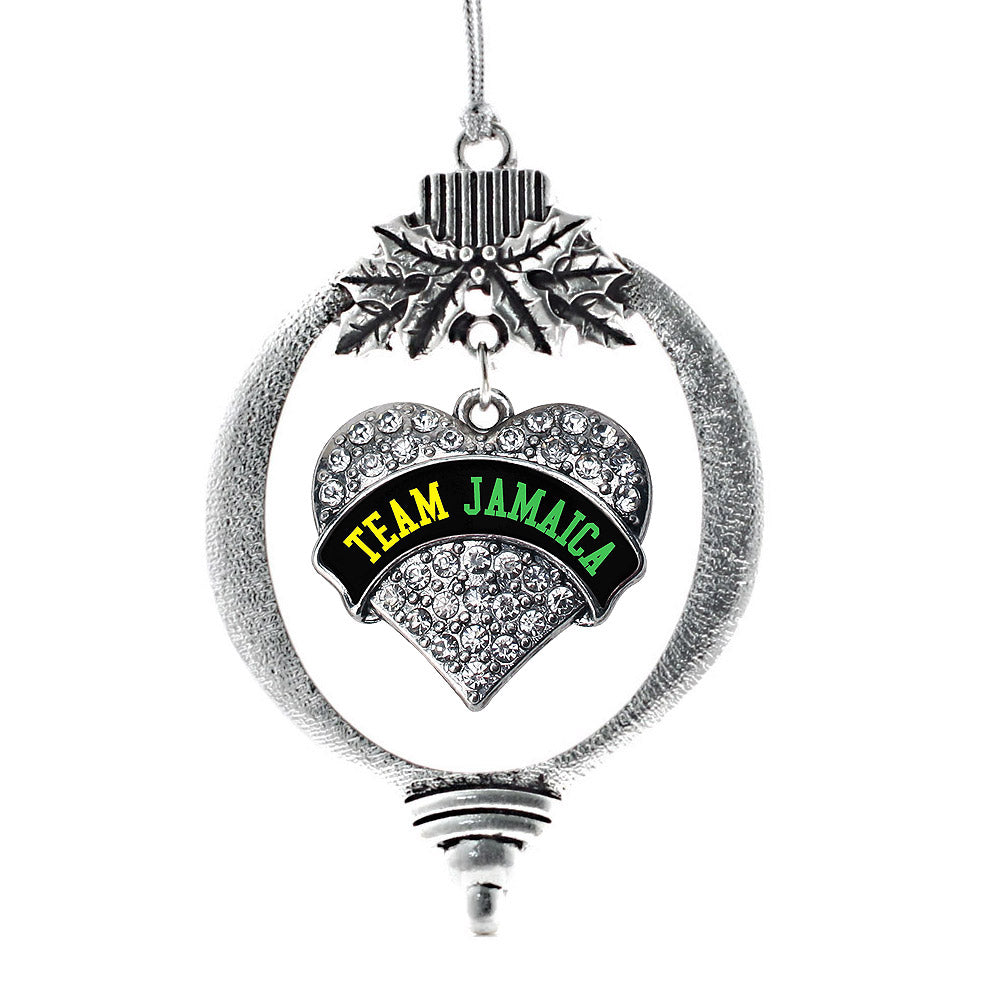 Our sparkling holiday ornament, equipped with a stylish silver rope and the Team Jamaica pave heart charm, is crafted from white metal with a silver plated finish and accented with cubic zirconia stones.